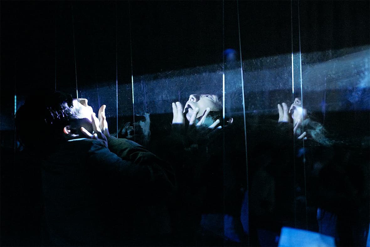 アクリルを使った、conduct hearing wall v2を演者や観客の音をリアルタイムリフレクションさせた即興音楽。